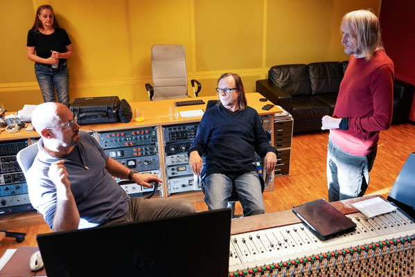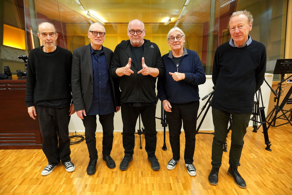 Die Kult-Jazzband OM nimmt mit Roli Mosimann 5 Tage bei uns auf. Welche Ehre! Gemischt wird ebenfalls auf unserem Cadac Mischpult! v.l.n.r.: Bobby Burri, Urs Leimgruber, Roli Mosimann, Fredy Studer und Christy Doran